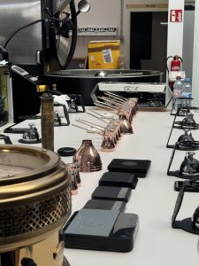 Anschließend ging es um die Technik und Extraktion, von Temperaturführung und Schaumbildung über Einfluss von Mahlgrad und Dosierung und natürlich nicht zu vergessen, das Arbeiten mit Gasbrennern und Sandheatern.